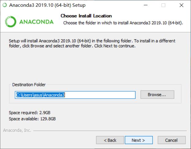 选择安装路径,这里建议装在C盘,也就是默认安装位置。(我的用户名是asus,选择Just me之后,路径就会自动选择在自己的windows账户下,默认是Administrator)安装完大概3个G,如果C盘空间很紧张也可以装在其他盘,但将来我们在使用时在读取速率上可能会有一定的影响。选择好了之后点击Next
