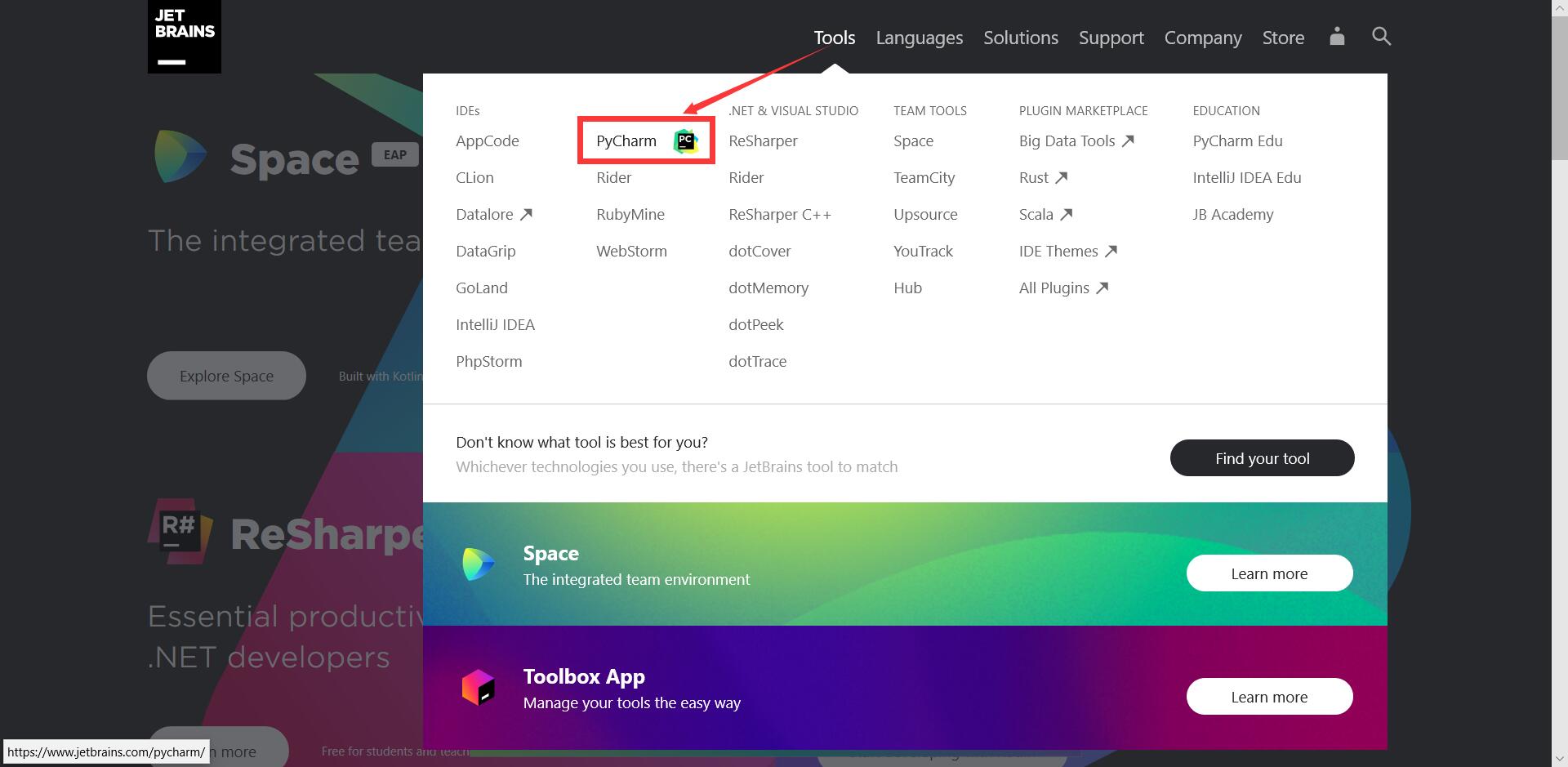 鼠标悬浮在Tools,然后点击Pycharm下载