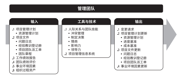 管理团队是跟踪团队成员工作表现,提供反馈,解决问题并管理团队变更,以优化项目绩效的过程。本过程的主要作用是,影响团队行为、管理冲突以及解决问题。本过程需要在整个项目期间开展。过程图如下所示: