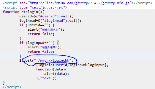 第二步:在jsp中加入jquery代码,如下图,画圈的代码很重要,./ 表示在当前web目录中(web服务器中可能有webapp1,webapp2,假如用的是http://localhost:8080/webapp2打开网站,若post方法中不带点,就会出现The requested resource is not available的提示,post的网址就变成http://localhost:8080/mychk/loginchk,这显然是不对的)