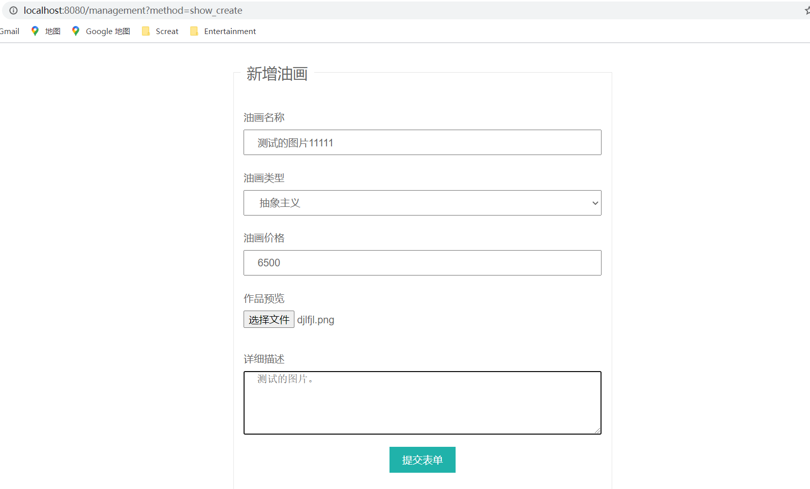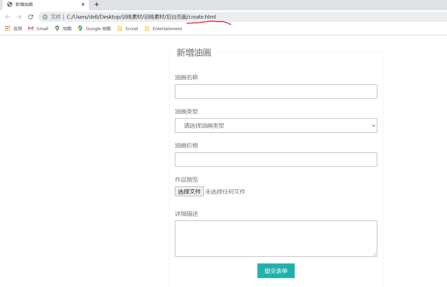 create.html外部文件引入: create.html是新增油画的表单页:打开create.html:可以看到这个效果: