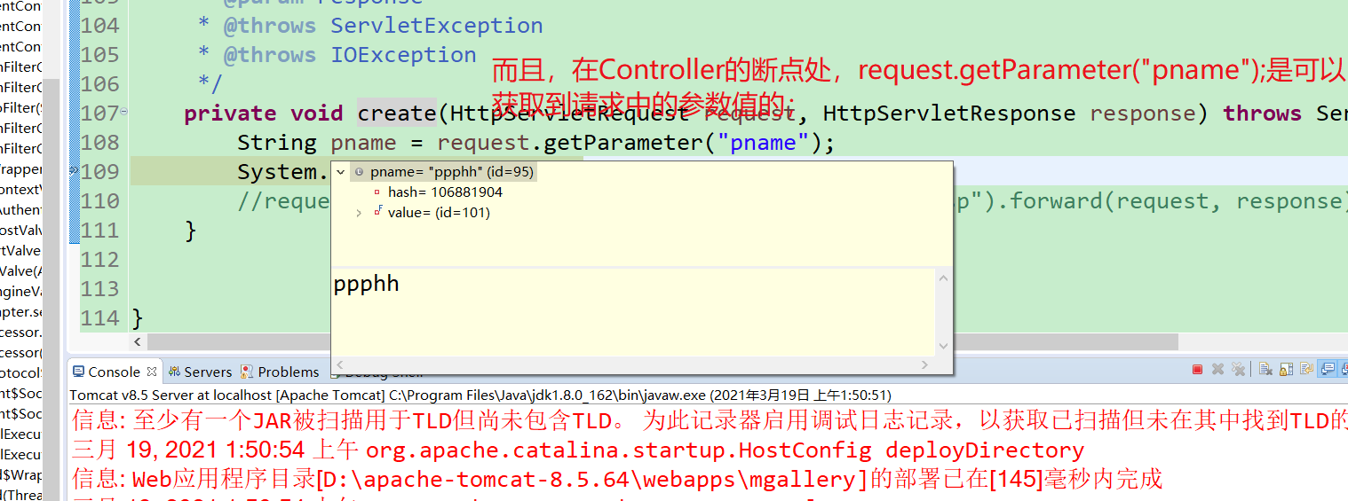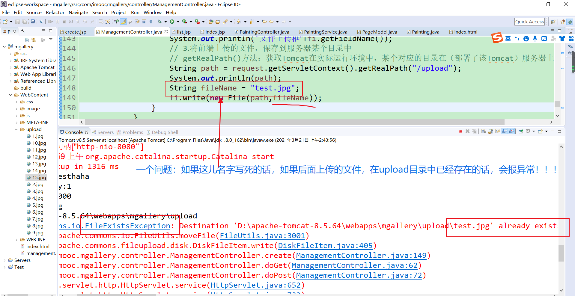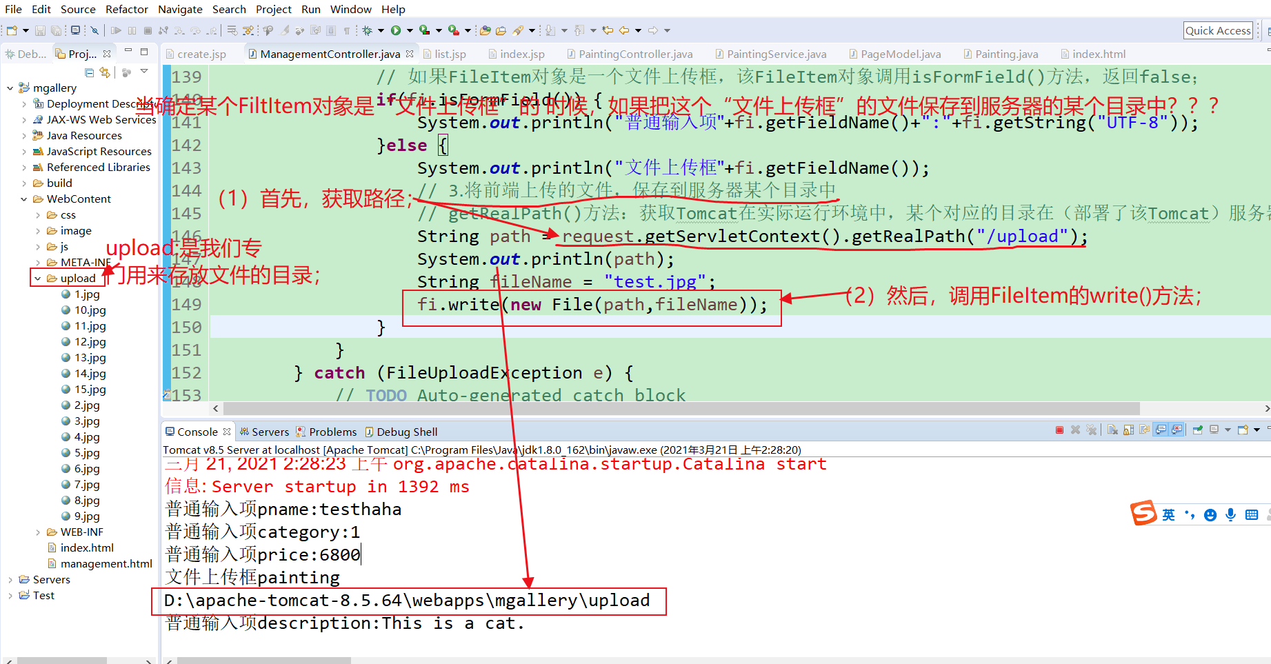 (3)还有需要注意【paintingService.create(painting);】和【response.sendRedirect("/management?method=list");】也都写在了try块中,需要注意下哦;这样写是更合理的,可以设想一下,万一上面的代码有异常了后,需要先处理异常,如果异常没有处理完,就不要执行“【paintingService.create(painting);】和【response.sendRedirect("/management?method=list");】”;;;;如果“【paintingService.create(painting);】和【response.sendRedirect("/management?method=list");】”不写在try块中,那么会发生这种现象:try块中代码报错了,异常处理完成后,本次的信息按理说已经是异常的了,应该重新发起一次正确的调用,但是程序会继续执行“【paintingService.create(painting);】和【response.sendRedirect("/management?method=list");】”,这显然是不合理的;;;说的好乱,但是自己应该能懂;;;