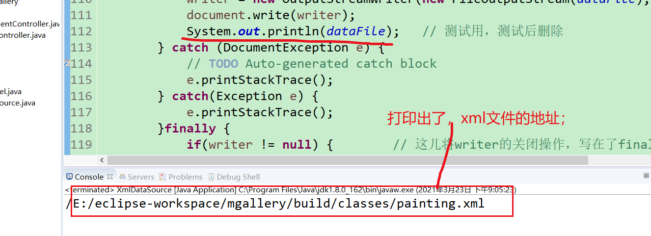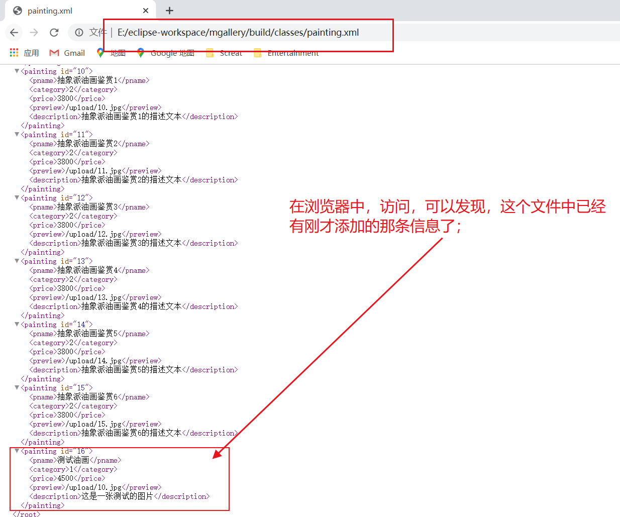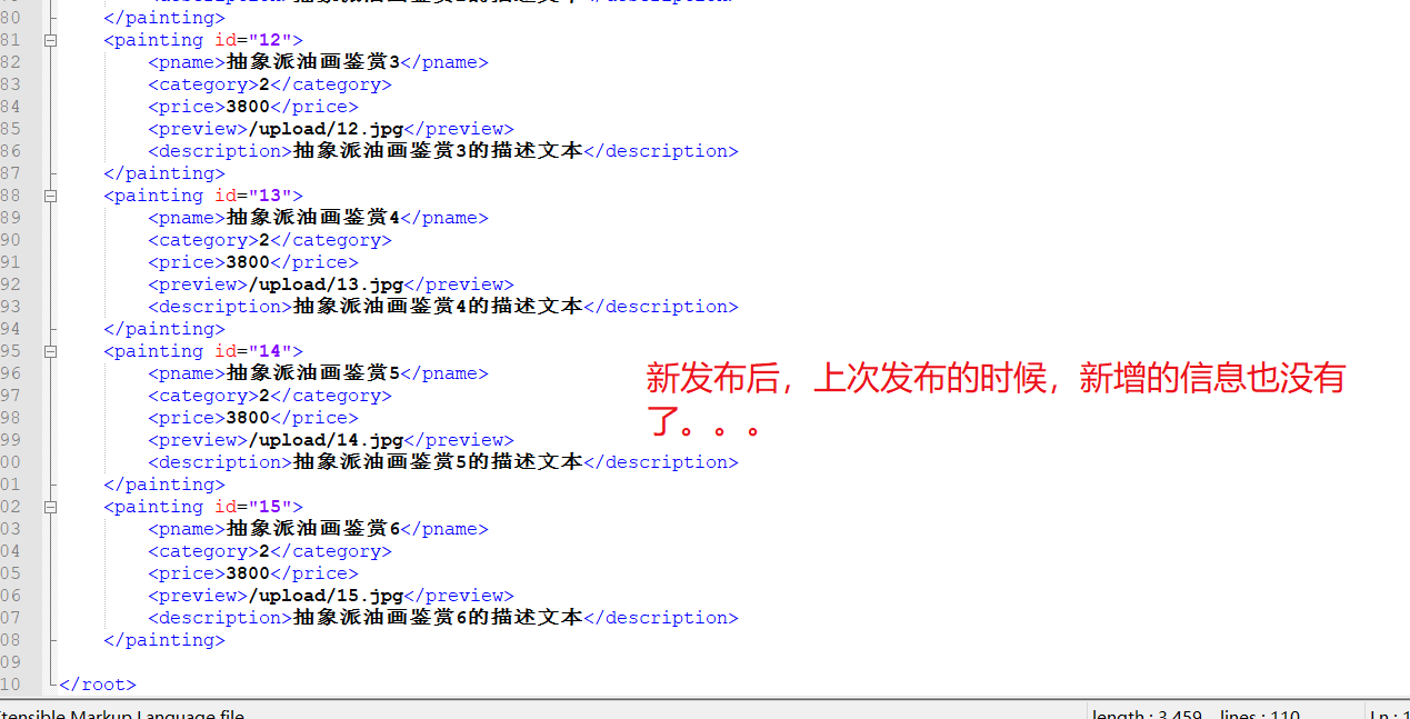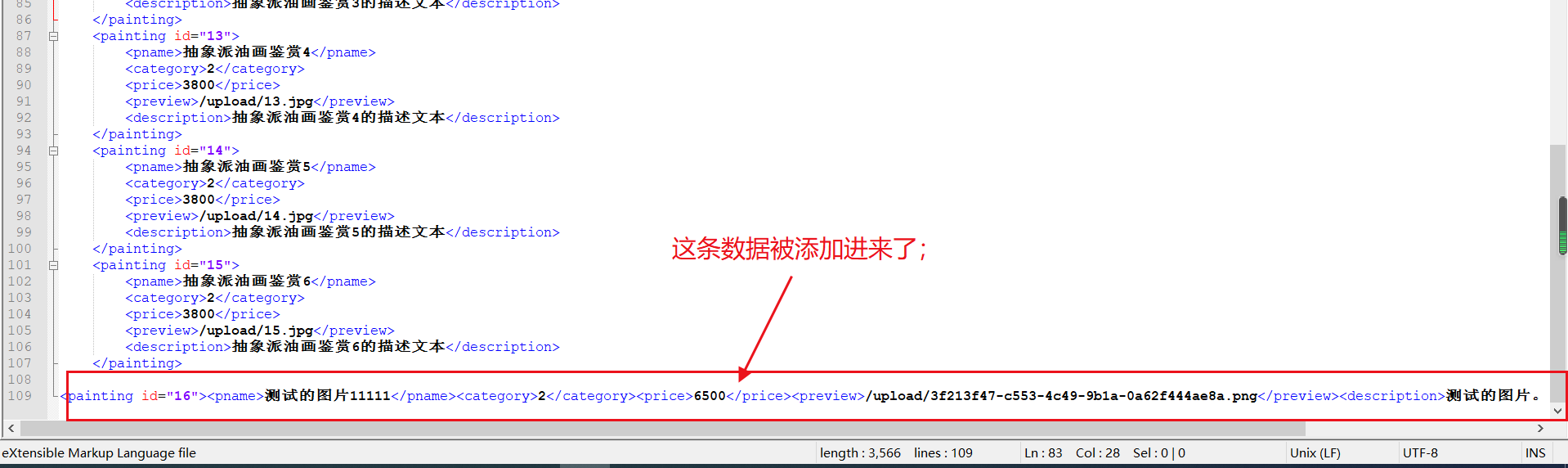 发现,此时油画信息已经写进xml文件中了,表示这部分的编码没有问题;;;;;;在实际工作中,为了测试某些功能代码是否编写成功,似乎可以采用这种,添加个main方法,来局部测试的套路!!!!!