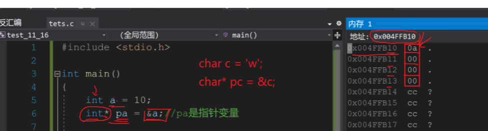 1.指针类型决定了再解引用(*)的时候一次访问几个字节,int*是4个字节,char*是一个,我们前面提到32位是4字节,这代表一个数据占用4字节,假设为10 那么就是00 00 00 0a(16进制,a代表10,拆开就是32个二进制){下面内存存放是倒着的}