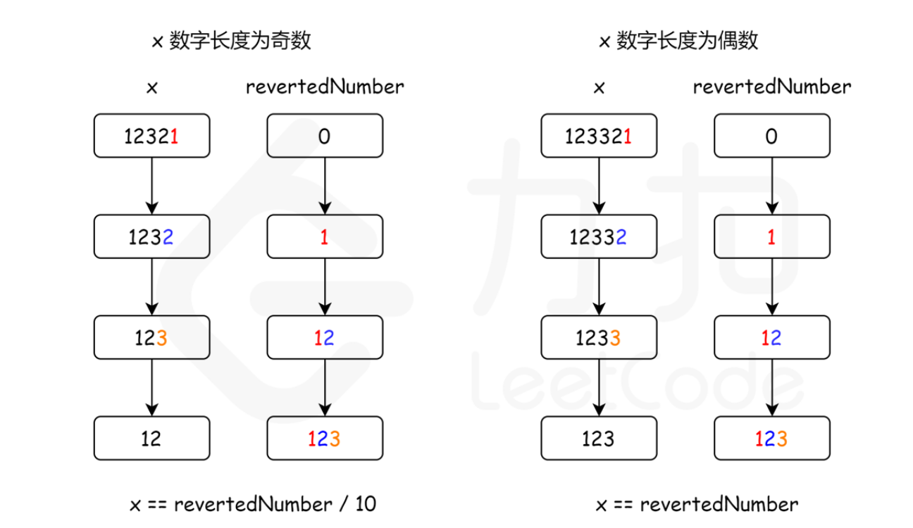 由于整个过程我们不断将原始数字除以 10,然后给反转后的数字乘上 10,所以,当原始数字小于或等于反转后的数字时,就意味着我们已经处理了一半位数的数字了。