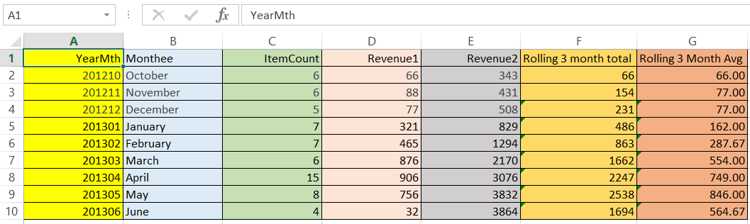 Columns F and G are of most interest to us as they contain the “Rolling 3 Month Total” and “Rolling 3 Month Average” that the gentleman expected to be calculated at runtime.