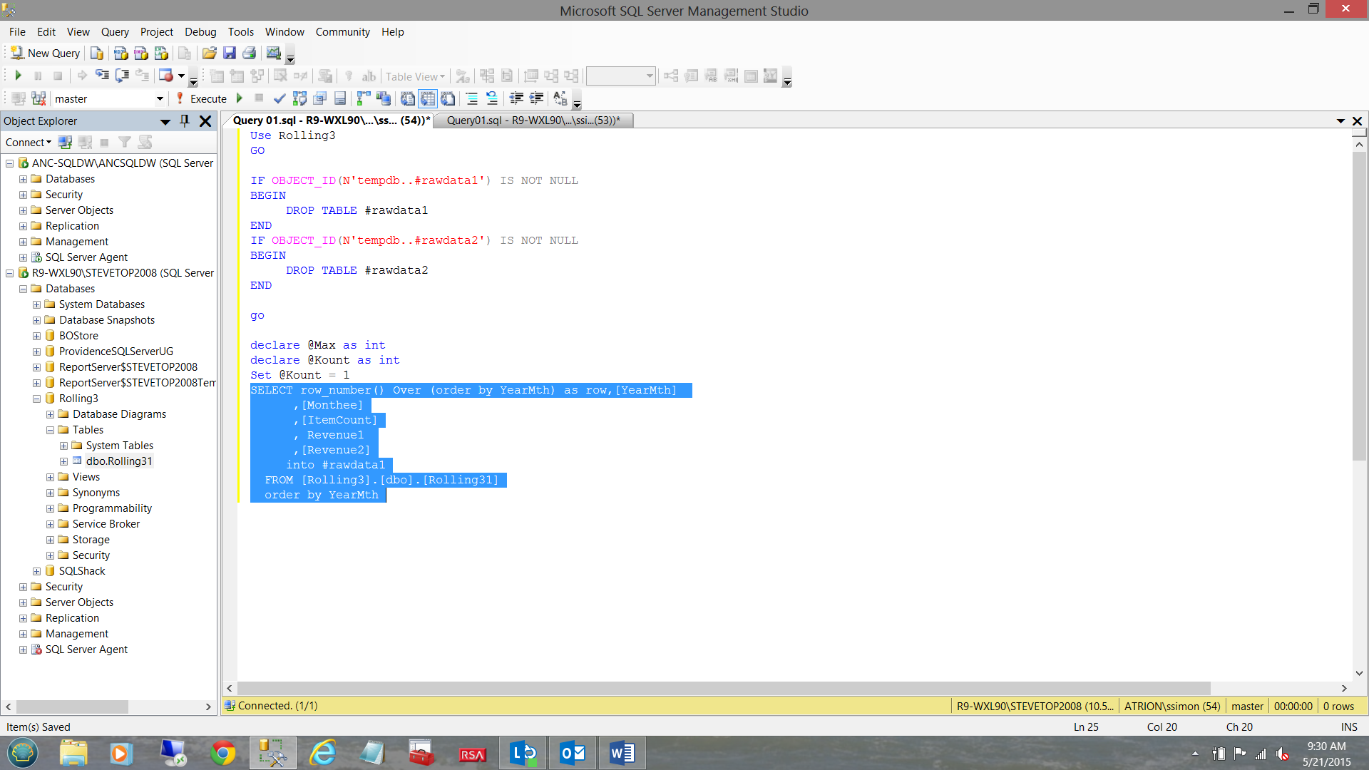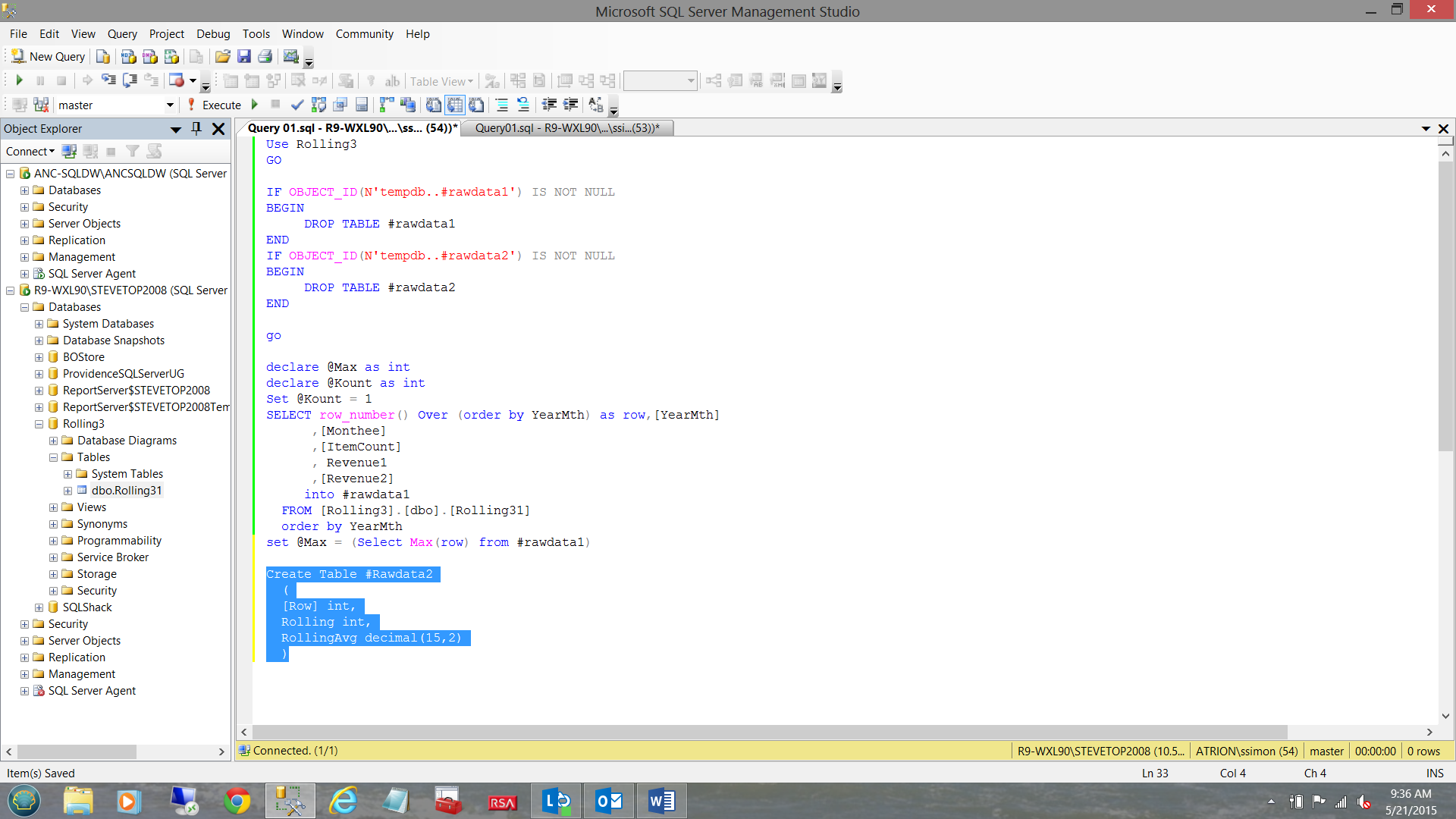 As may be seen in the screenshot above, we have done something a bit unorthodox by creating a temporary table called #rawdata2. Creating the temporary table at this point requires a bit of explanation.