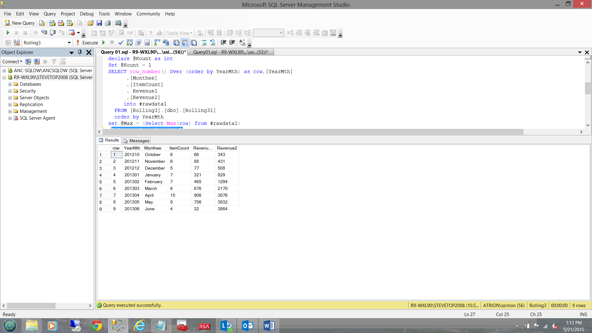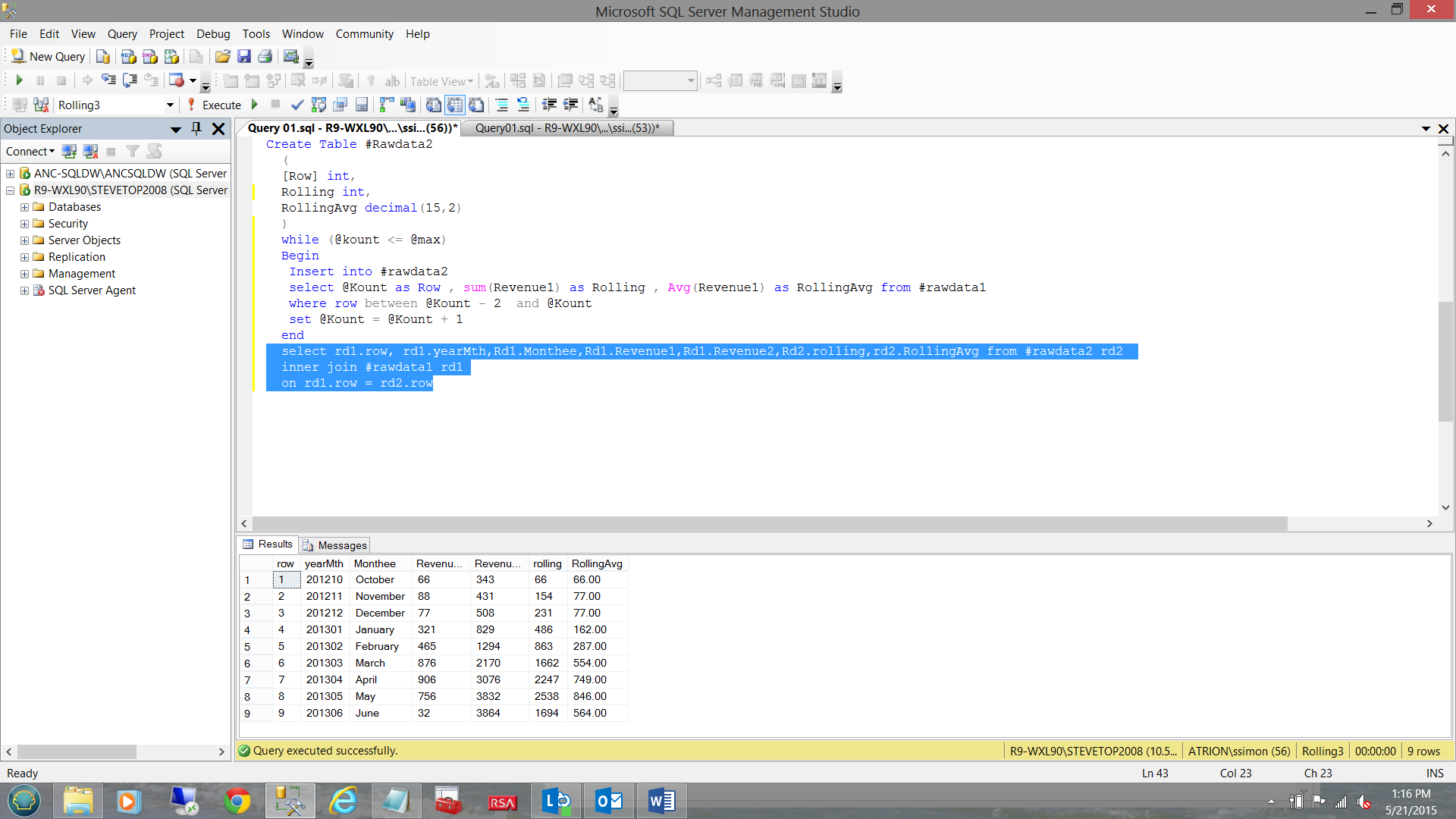 select rd1.row, rd1.yearMth,Rd1.Monthee,Rd1.Revenue1,Rd1.Revenue2,Rd2.rolling,rd2.RollingAvg from #rawdata2 rd2