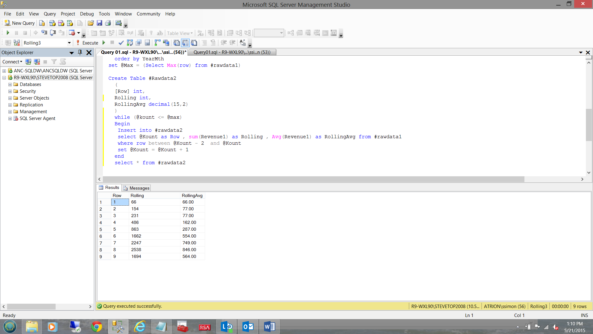 select @Kount as Row , sum(Revenue1) as Rolling , Avg(Revenue1) as RollingAvg from #rawdata1