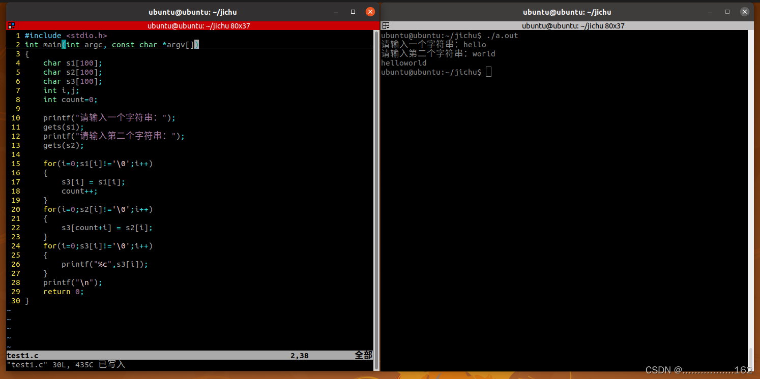 2.终端输入两个字符串。然后把后一个字符串拼接前一个字符串后面