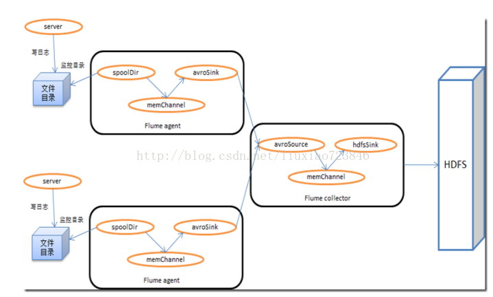 线上api接口服务通过log4j往本地磁盘上打印日志,在接口服务器上安装flume,通过exec source收集日志,然后通过avro sink将日志发送到汇总服务器上的flume;在汇总服务器上的flume,通过avro source接收到日志,然后通过hdfs sink备份到hdfs上。