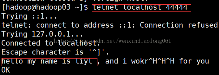3、测试:通过telnet命令向44444端口写数据,查看flume的agent输出: