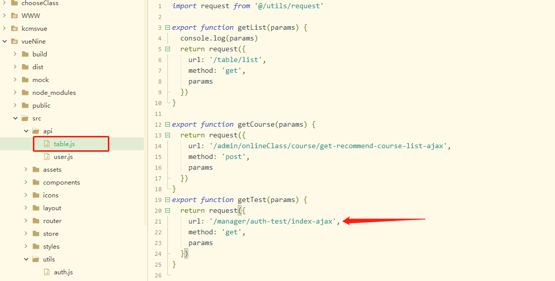3. 在 api 里面对应的文件里,我这里是 table.js 文件里,把接口补全