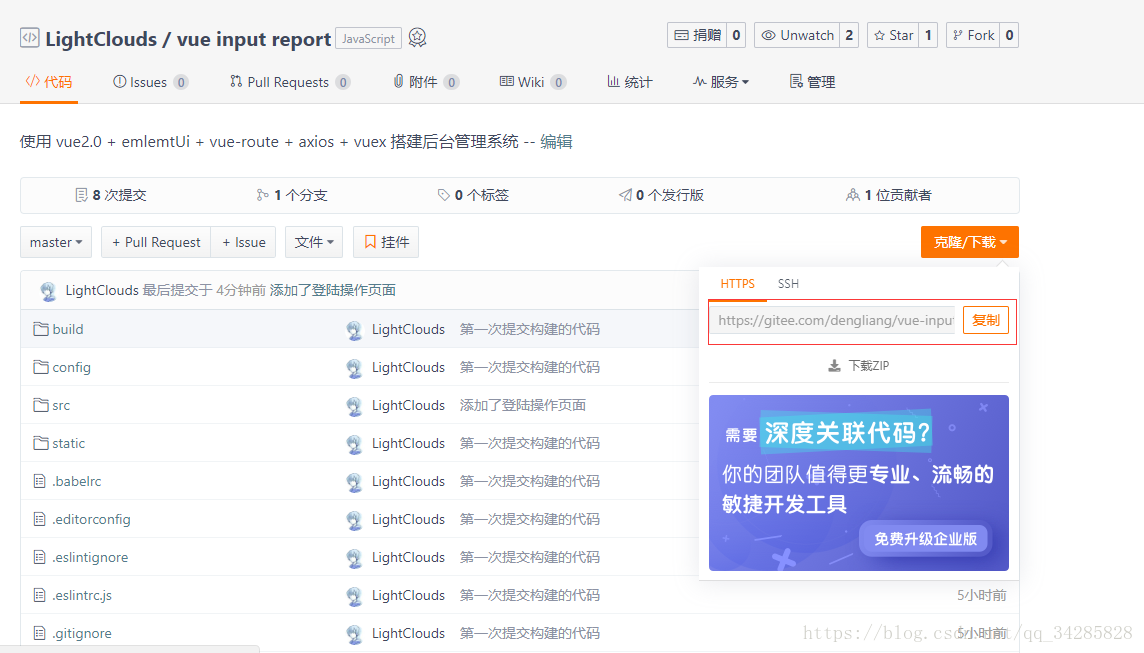 代码管理工具git:git怎么使用,请自行百度,我一般采用的是在webStorm中通过git在代码库(码云)中进行下载,码云中代码库项目的创建很简单与github上类似,如有不懂请自行摸索,通过git工具pull项目到本地,如下图所示