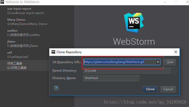 第三步:粘贴刚复制的路径,点击clone将会拉去仓库中的项目到本地