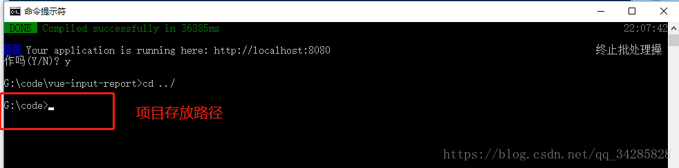 第二步 初始化项目,首先打开需要存放的项目位置,然后在输入vue init webpack vue-input-report 直接一路回车就行,然后等待项目的初始化。