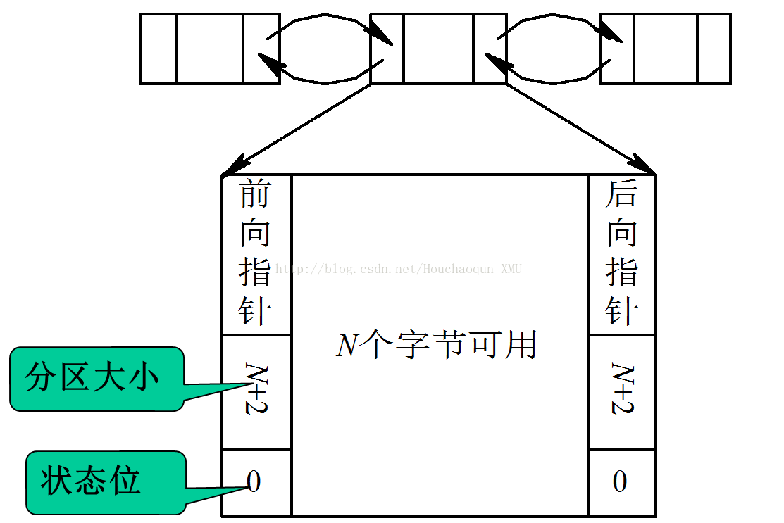 (2) 空闲分区链。为了实现对空闲分区的分配和链接,在每个分区的起始部分,设置一些用于控制分区分配的信息,以及用于链接各分区所用的前向指针;在分区尾部则设置一后向指针,通过前、后向链接指针,可将所有的空闲分区链接成一个双向链,如下图所示: