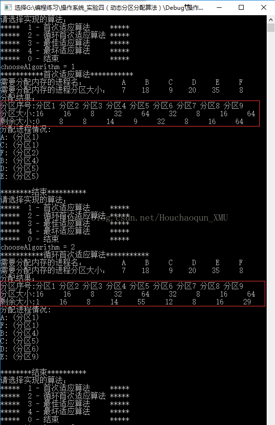 3)输入:空闲分区个数n,空闲分区大小P1, … ,Pn,进程个数m,进程需要的分区大小S1, … ,Sm,算法选择1-首次适应算法,2-循环首次适应算法,3-最佳适应算法,4-最坏适应算法。