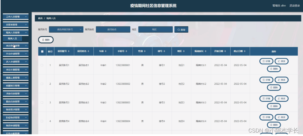 隔离人员管理,管理员可在隔离人员管理页面查看居民账号、居民姓名、年龄、手机号、性别、楼号、地区、隔离时长、开始日期、截止日期等内容,还可进行修改或删除等操作,如图5-6所示。