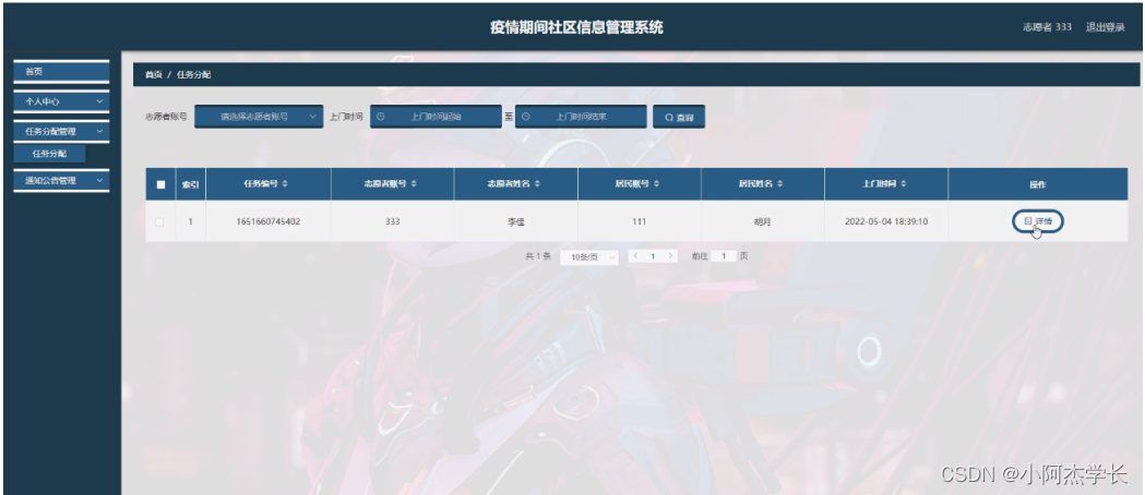 任务分配管理,志愿者可在任务分配管理页面查看任务编号、志愿者账号、志愿者姓名、居民账号、居民姓名、上门时间等内容,如图5-23所示。