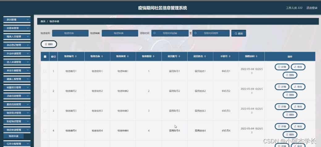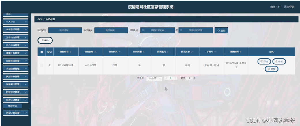物资申请管理,居民可在物资申请管理页面查看物资编号、物资名称、物资种类、物资数量、居民账号、居民姓名、手机号、领取时间等内容,还可进行修改或删除等操作,如图5-16所示。