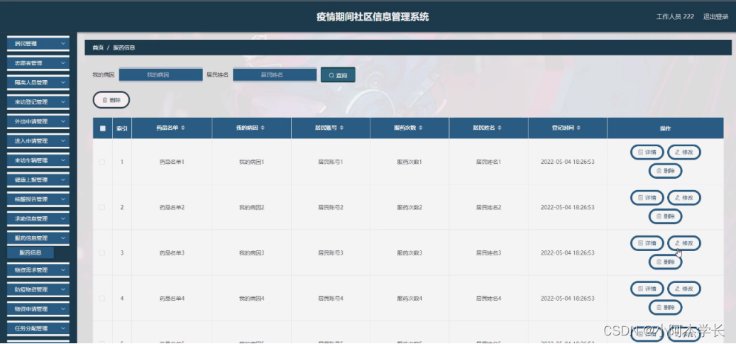 服药信息管理,工作人员可在服药信息管理页面查看药品名单、我的病因、居民账号、