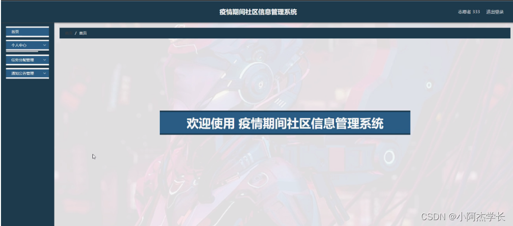 志愿者通过登录进入系统可查看个人中心、任务分配管理、通知公告管理等内容,如图