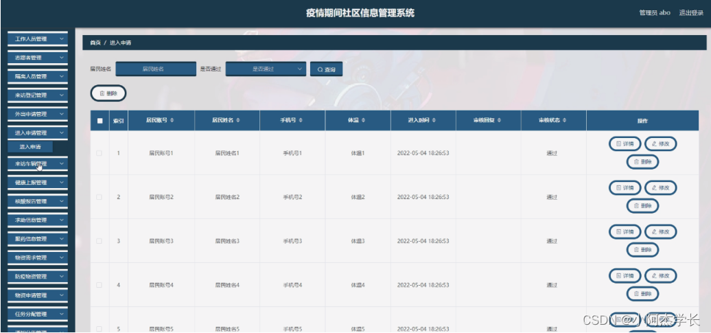 进入申请管理,管理员可在进入申请管理页面查看居民账号、居民姓名、手机号、体温、进入时间、审核回复、审核状态等内容,还可进行修改或删除等操作,如图5-9所示。