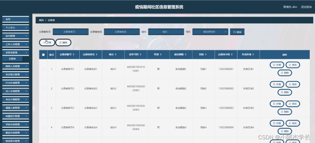 志愿者管理,管理员可在志愿者管理页面查看志愿者账号、志愿者姓名、城市、证件号码、性别、政治面貌、民族、志愿者手机、负责区域等内容,还可进行新增、修改或删除等操作,如图5-5所示。