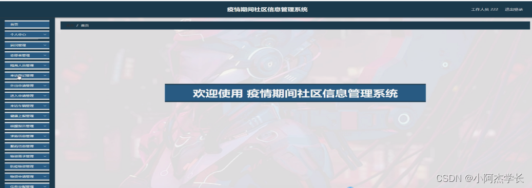 管理员登录系统后,可以对个人中心、工作人员管理、居民管理、志愿者管理、隔离人员管理、来访登记管理、外出申请管理、进入申请管理、来访车辆管理、健康上报管理、核酸报告管理、求助信息管理、服药信息管理、物资需求管理、防疫物资管理、物资申请管理、任务分配管理、通知公告管理等功能进行相应操作,如图5-2所示。