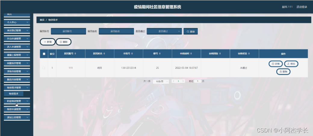 物资需求管理,居民可在物资需求管理页面查看居民账号、居民姓名、手机号、楼号、申请时间、审核回复、审核状态等内容,还可进行新增、修改或删除等操作,如图5-15所示。