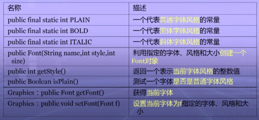 2.字体:Font类,以及Graphics类中与字体有关的方法: