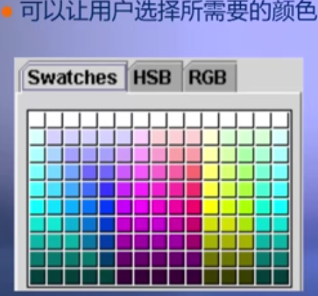 (3)能提供格式化的信息并允许用户选择的,例如:JColorChooser、JFileChooser、JTable、JTree
