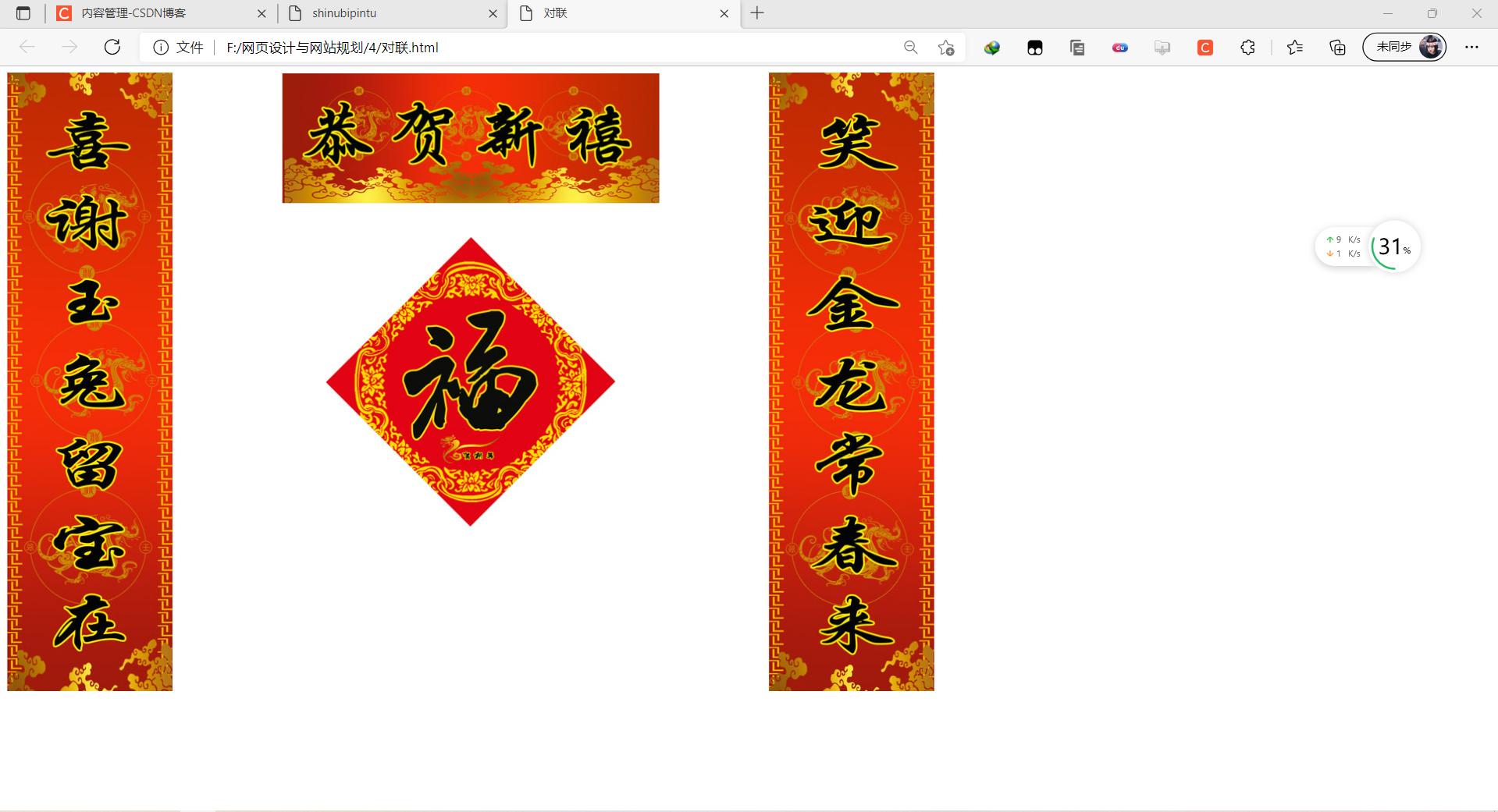 以上就是安静香氛最近收集整理的关于网页设计与网站规划 作业17 对联排版的全部内容,更多相关网页设计与网站规划内容请搜索靠谱客的其他文章。