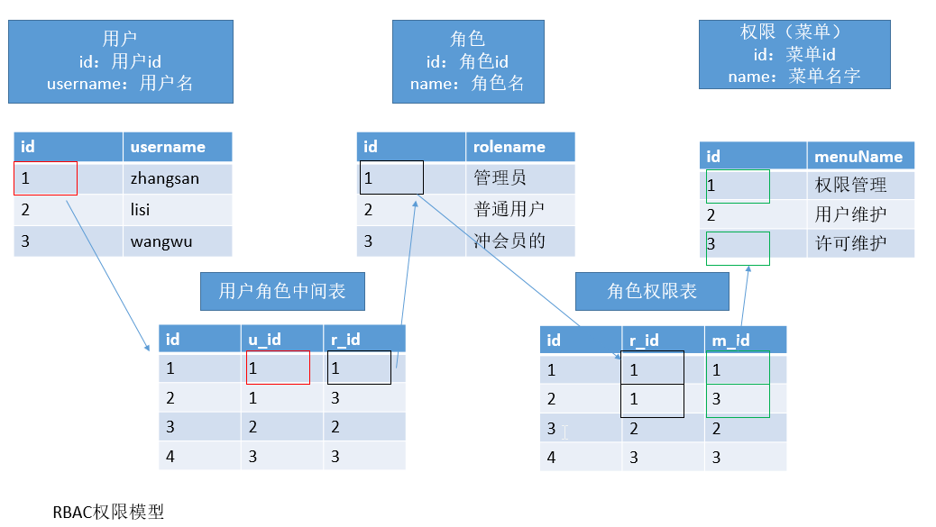 用户:每个人都是一个用户;角色:公司(职务);系统(角色):如,管理员,会员,项目经理...权限:能操作哪些东西;举例: 我,秦始皇,钱;我是谁?leifengyang(用户)来到公司;职务 :讲师(角色)能干什么?: 讲课,给学生解决问题;(权限)用户-----角色;(多对多) 一个用户有很多角色;一个角色下也是很多用户;用户---用户_角色中间表---角色角色----权限(菜单)(多对多);一个角色能操作很多菜单;一个菜单很多角色都能操作角色(用户身份)---角色_权限_中间表---权限(菜单)RBAC:基于 角色用户---(角色)---权限:用户如果直接对应权限,同一类的用户他们操作的菜单都一样,我们并没有将共同因素抽取出来,如果有100万个用户,每个用户都有很多权限,用户和权限直接对应,中 间表非常庞大臃肿直接对应;layerui(弹出层插件)