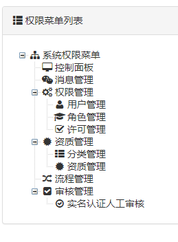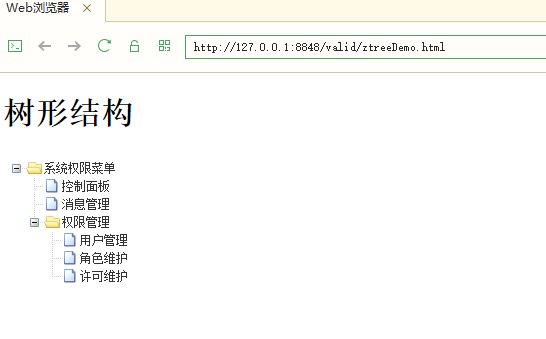 <!DOCTYPE html> <html> <head> <meta charset="utf-8"> <title></title> <script type="text/javascript" src="js/jquery-3.2.1.min.js"></script> <script type="text/javascript" src="zTree_v3-3.5.28/js/jquery.ztree.all.js"></script> <link rel="stylesheet" href="zTree_v3-3.5.28/css/zTreeStyle/zTreeStyle.css" /> </head> <body> <h1>树形结构</h1> <ul id="myztree" class="ztree"></ul> </body> <script> //ztree的一些设置 var setting = { data: { simpleData:{ enable: true } } }; var zNodes =[ {id:1, pId:0, name:"系统权限菜单", open:true}, {id:2, pId:1, name:"控制面板"}, {id:3, pId:1, name:"消息管理"}, {id:4, pId:1, name:"权限管理"}, {id:5, pId:4, name:"用户管理"}, {id:6, pId:4, name:"角色维护"}, {id:7, pId:4, name:"许可维护"}, ]; $(function(){ $.fn.zTree.init($("#myztree"), setting, zNodes); }) </script> </html>