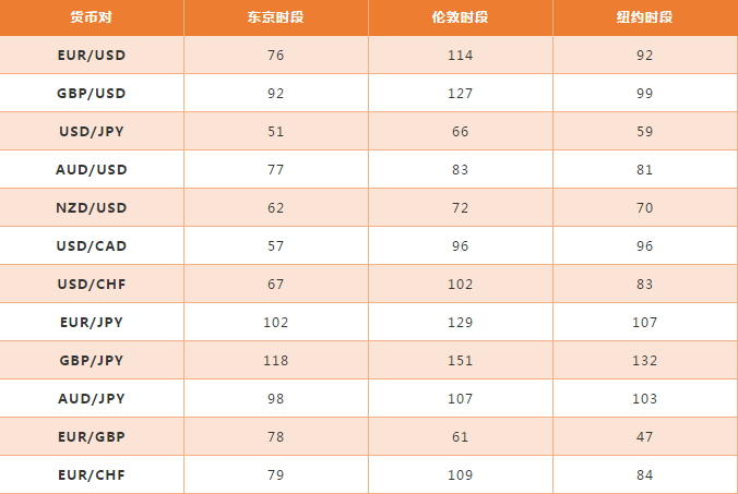 现在让我们来看看主要货币对在每个货币交易日不同交易时段的平均波动点位。