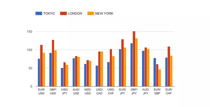从表中,你会看到伦敦时段交易相对最为活跃。另外,一些货币对的波动比其他货币对大得多。