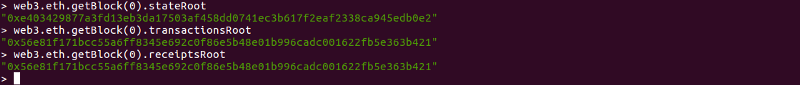 为了找到某一个区块中特定的默克尔帕特里夏树,我们需要获得它的根哈希作为索引。下图中的三条指令分别可以使我们得到创世区块中状态前缀树、交易前缀树和收据前缀树的根哈希值。