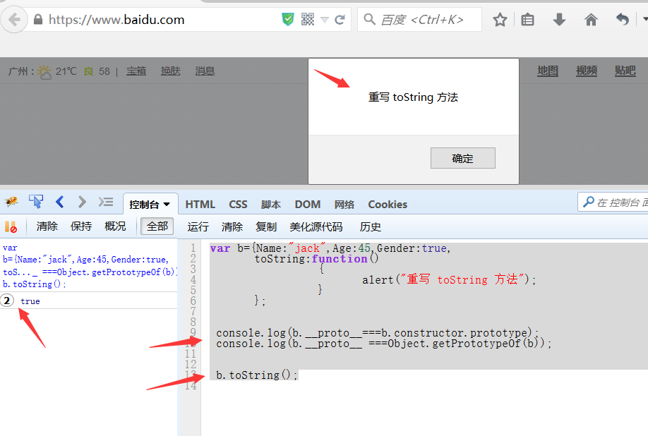 原型:JavaScript 对象有一个指向一个原型对象的链。当试图访问一个对象的属性时,它不仅仅在该对象上搜寻,还会搜寻该对象的原型,以及该对象的原型的原型,依此层层向上搜索,直到找到一个名字匹配的属性或到达原型链的末尾。简而言之,即在 JavaScript 中,任意对象的 __proto__ 属性 (原型)(而其值等于该对象构造函数的 prototype 属性 ,obj.__proto__===obj.constructor.prototype 。)