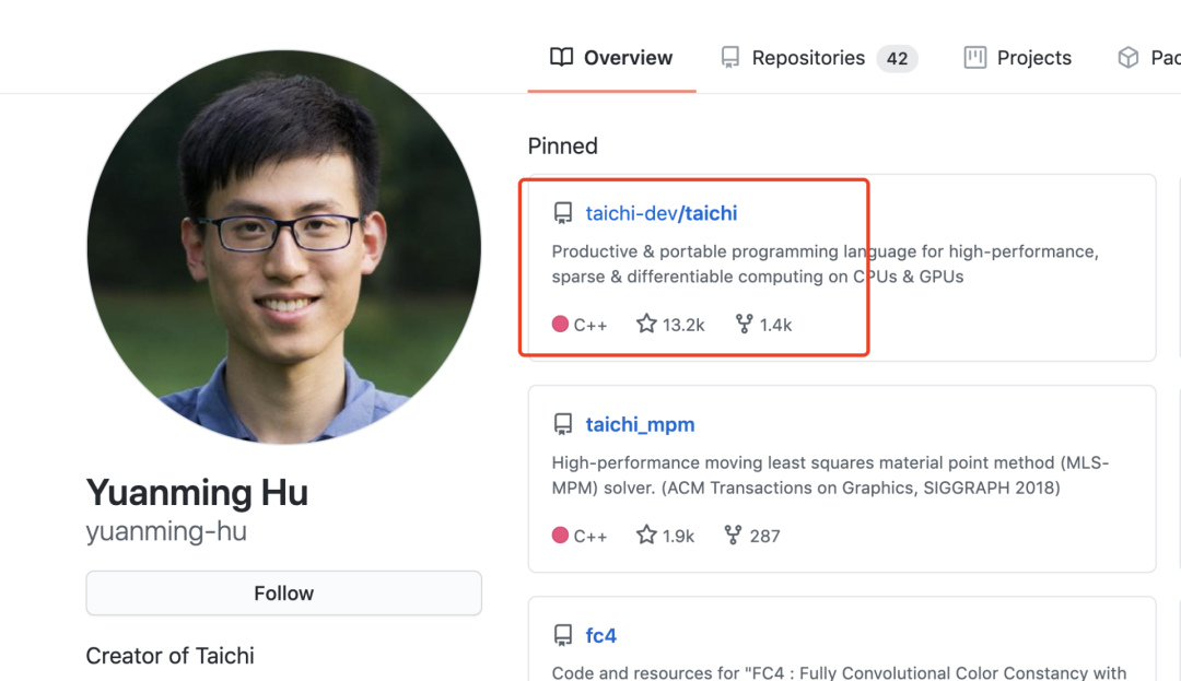 两年前,清华姚班出身的MIT大神胡渊鸣开发了面向物理模拟的Taichi(太极)开源编程语言,大大降低了这个领域的门槛。