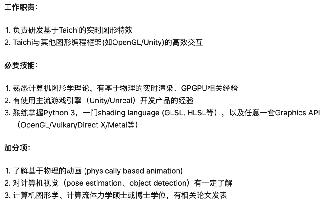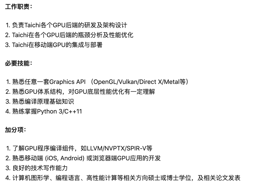 公司名字叫做太极图形 (Taichi Graphics) ,现在正在招收GPU后端研发工程师、编译器研发工程师、图形研发工程师三个正式岗位以及对应的实习生。