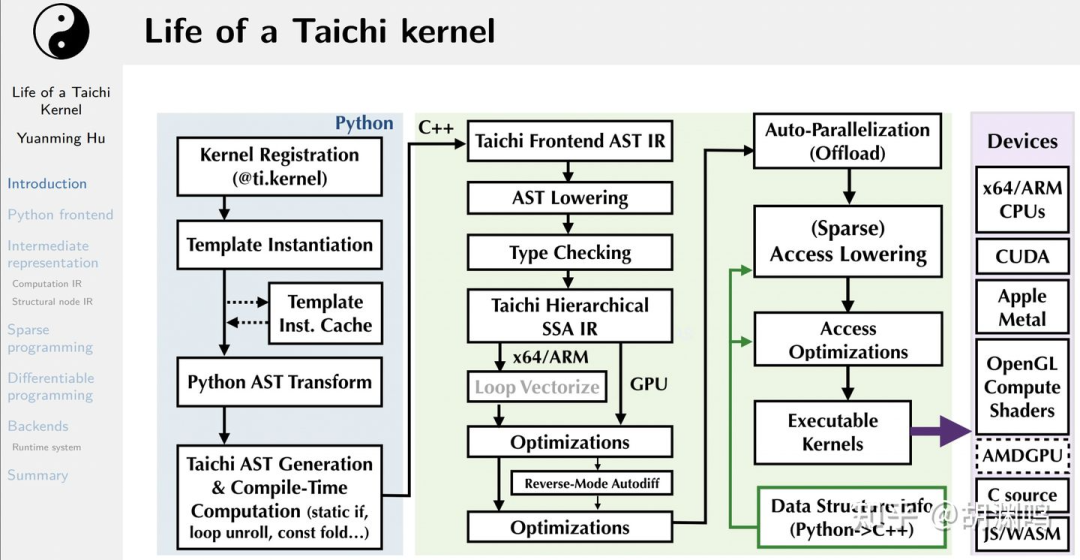 胡渊鸣本人在知乎介绍到,Taichi在设计之初就注重通过提供领域特定语言抽象 (domain-specific language abstractions) 与编译优化 (compiler optimizations) 来同时达到高生产力和高性能,并满足新兴视觉计算模式的需求。其可移植性通过多后端 (multiple backends) 的设计来达到,包括 x64, ARM, CUDA, Metal, OpenGL compute shader等。