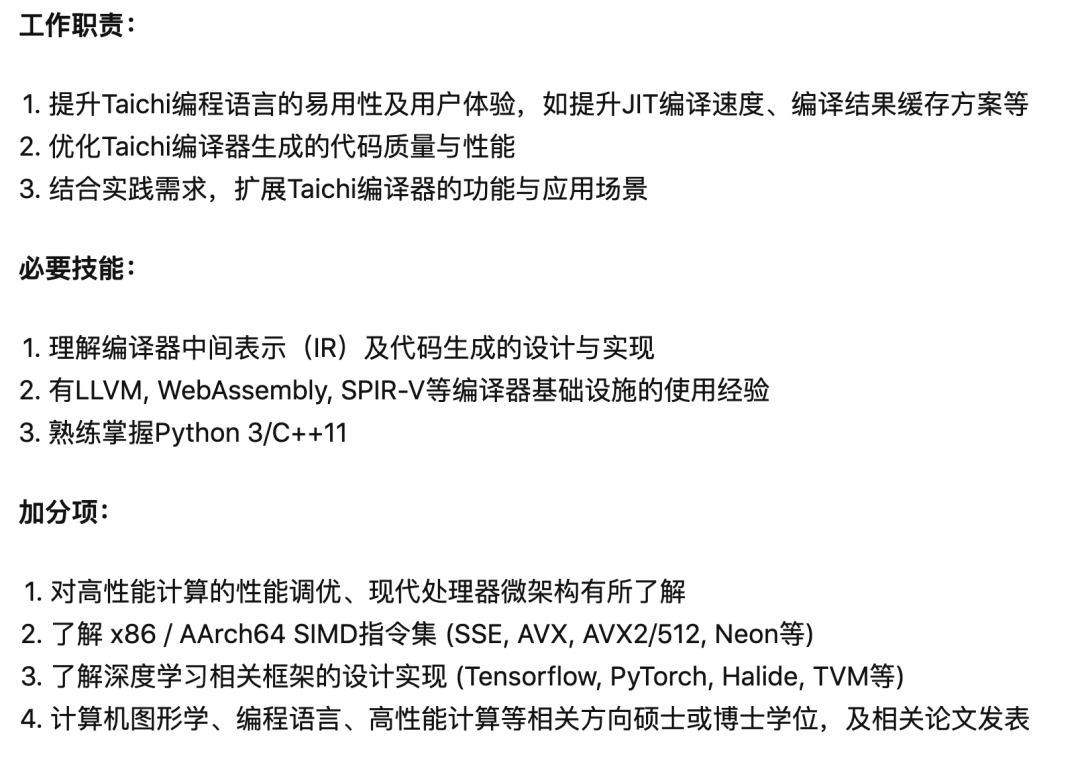 注:以上岗位均欢迎对应的实习生。也欢迎对Taichi编程语言的软件工程、编译器其他组件(Python前端、网站、文档等)感兴趣的同学投递简历 :-)