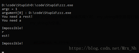 值得注意的是,如上例子,第一行读入"You need a rest!"后遇到第一个分割符号'r',此时my_string为"You need a",但是后面的"est!"并没有被忽略到,事实上,my_string会记录两个分割符号之间的所有符号包括回车,不像划分字符串的函数strtok,参数中可以有多个分割符号,所以使用getline()函数的第三个参数时需要注意。