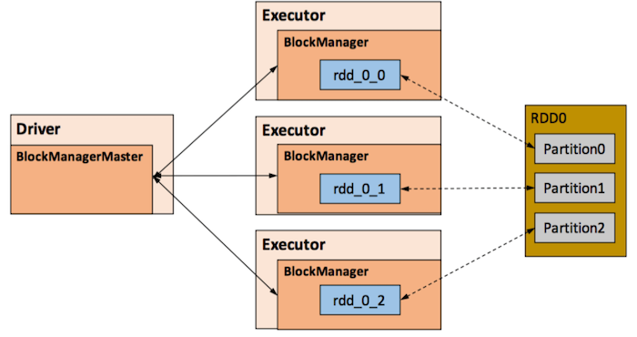 在具体实现时Driver端和Executor端的Storage模块构成了主从式的架构,即Driver端的BlockManager为Master,Executor端的BlockManager为Slave。Driver端的Master负责整个Spark应用程序的Block的元数据信息的管理和维护,而Executor端的Slave需要将Block的更新等状态上报到Master,同时接收Master的命令,例如新增或删除一个RDD。