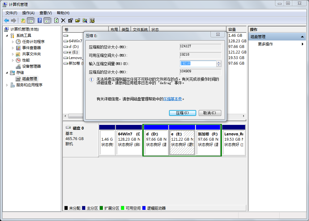在windows系统下,右键‘我的电脑’,选择‘管理’,选择‘存储’选项卡下的‘磁盘管理’,右键某一分区(如E盘),点击‘压缩卷’,之后,windows会自动计算最大可压缩空间。