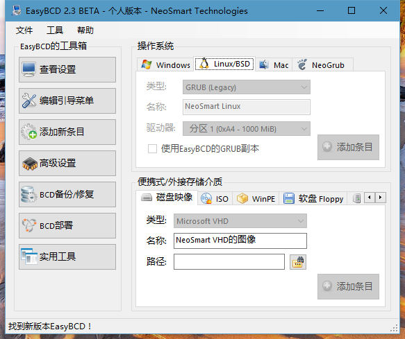 打开EasyBCD,点击“添加新条目”,选择“Linux/BCD”,在“驱动器”中选择含有“linux”字样的分区,点击“添加条目”即可。