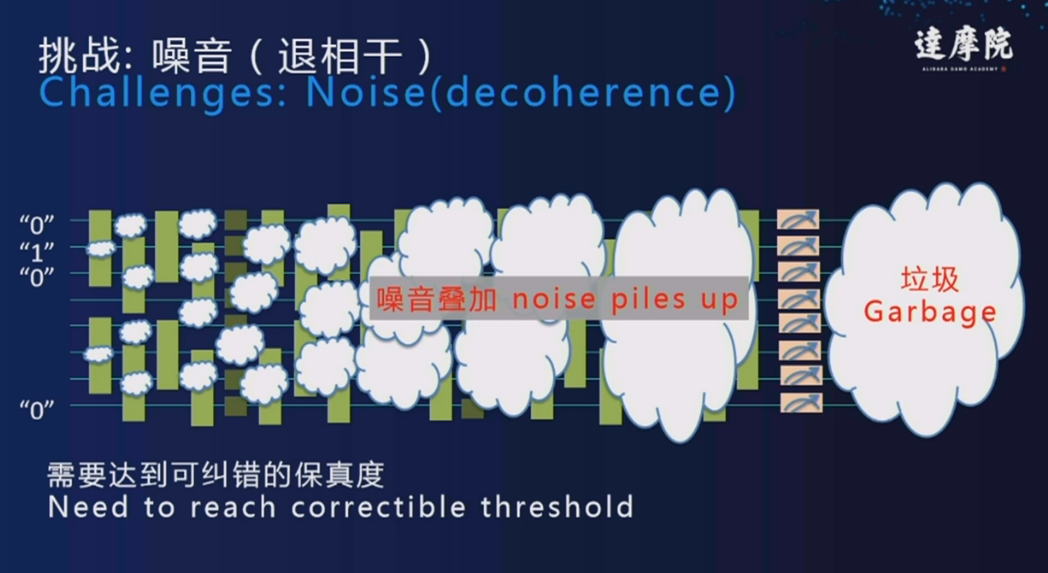 - 噪音:越多比特越垃圾,需要达到可纠错的保真度。要看比特数和精度,这是一个基本问题。量子信息会有死掉的情况,会流失到其他系统内。如果计算很长,错误很大。