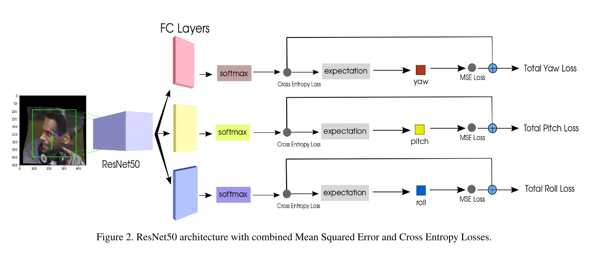 在进行训练数据准备的时候,对于输入的训练数据[ pitch, yaw, roll],作者将[0,180]度分成66个bins,然后根据三个角度所处的bin生成label,并用来训练分类层;根据分类层出来的概率分布,和66个bins的值求期望得出回归的值,最后以加权的方式来整合分类损失和回归损失。